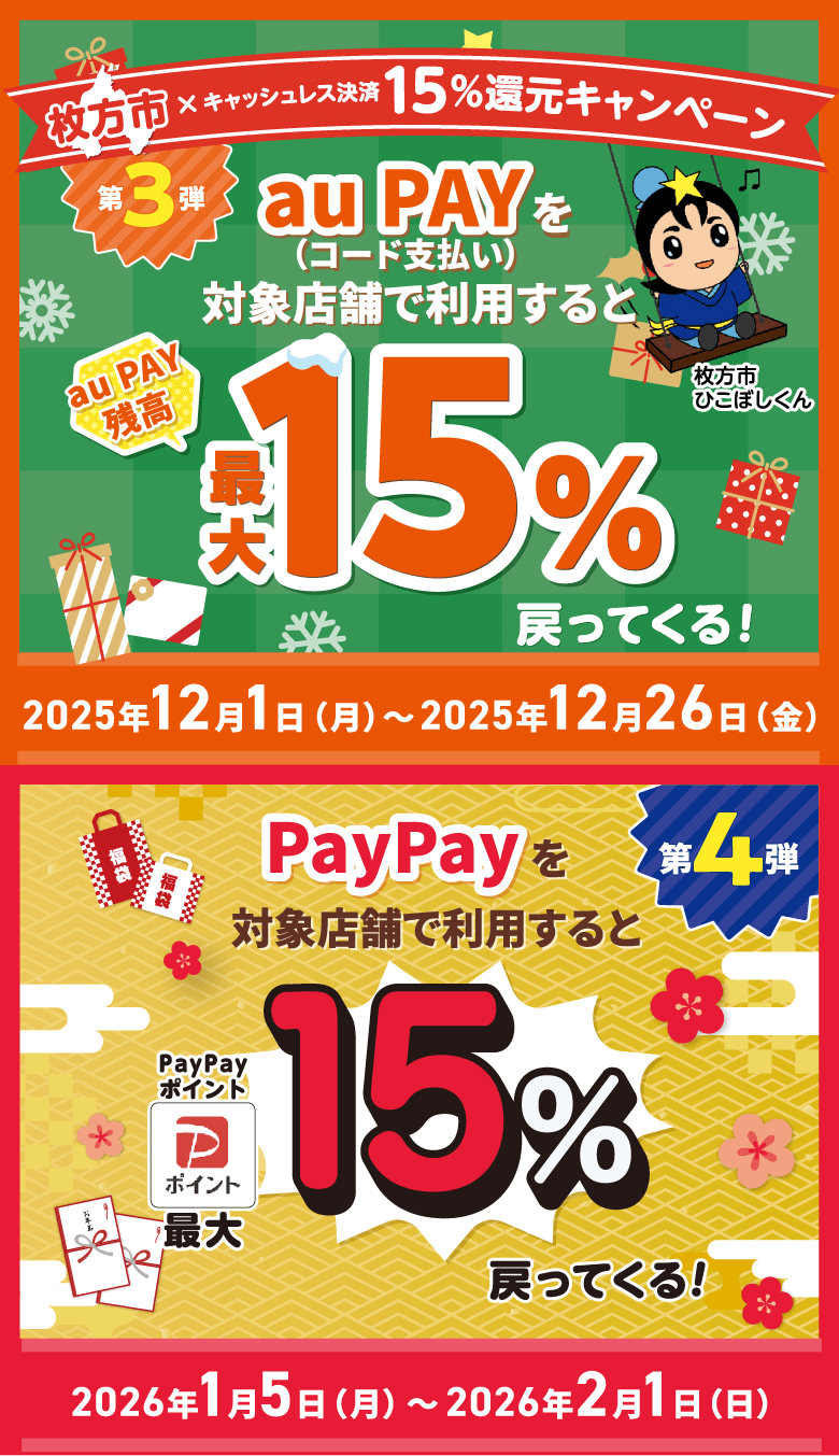 PAY」または「PayPay」で決済すると、決済額の最大15%を還元します。
